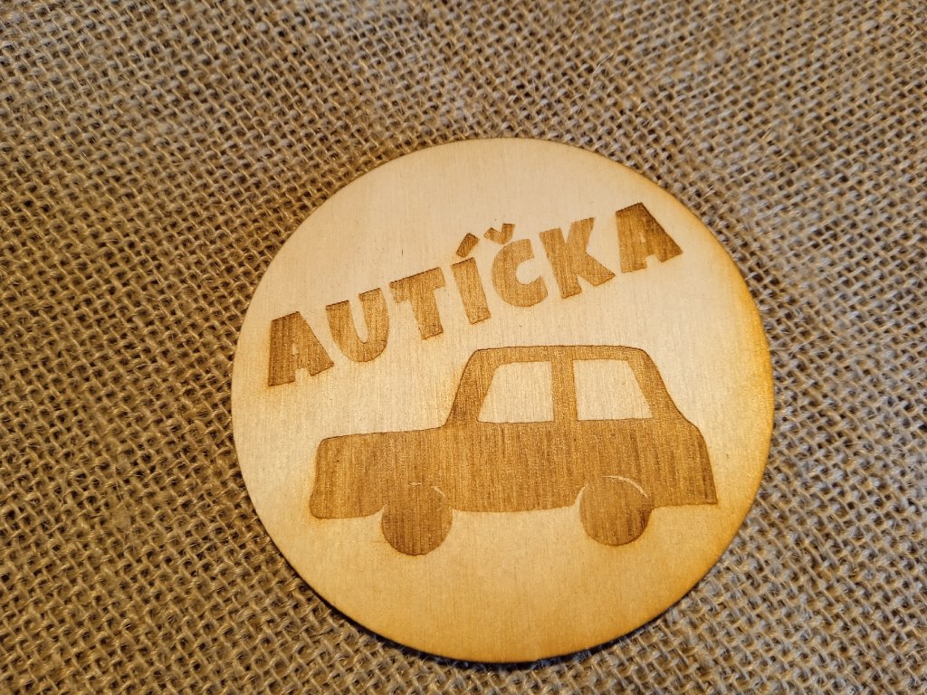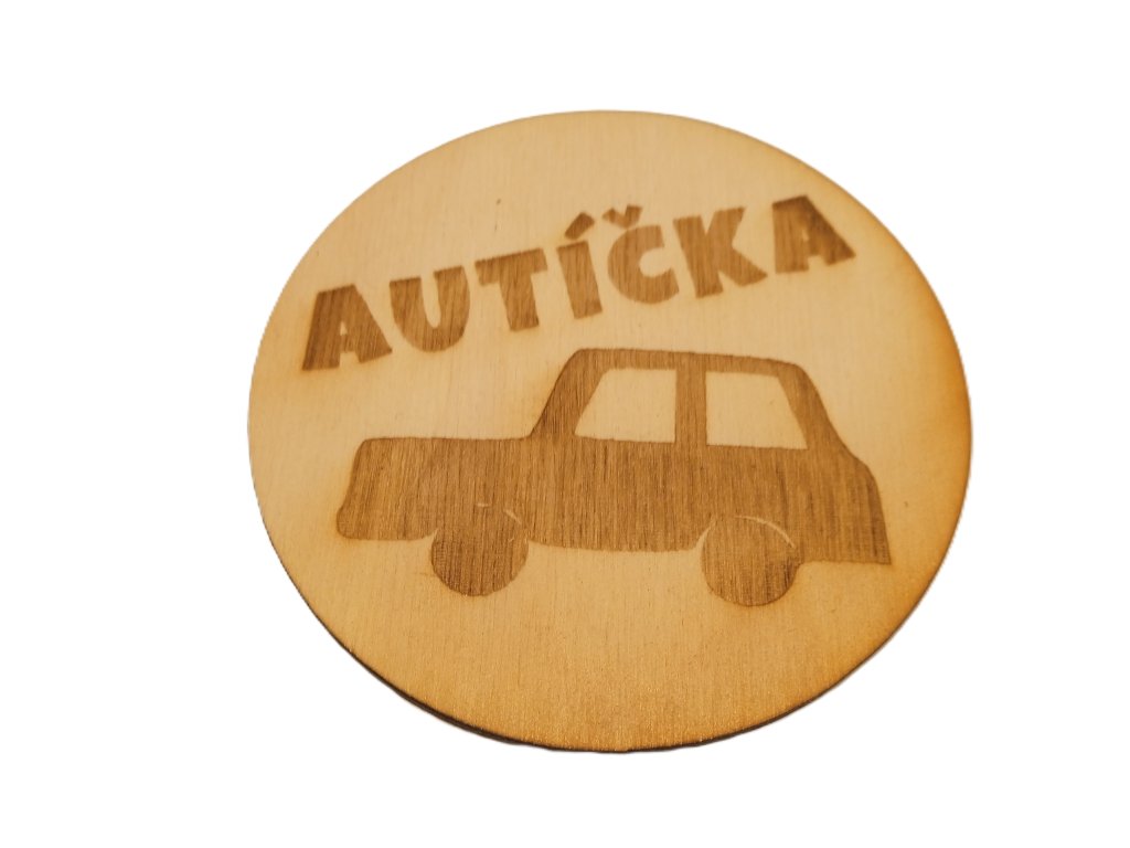 Dřevěná cedulka s vygravírovaným názvem hraček