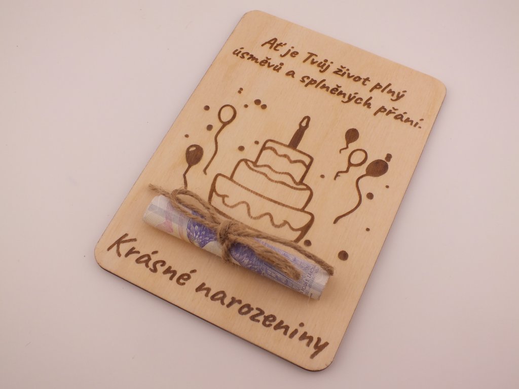 Dřevěná obálka na peníze – originální způsob, jak darovat bankovku s osobním přáním Stylová obálka vyrobená z březové překližky o síle 3 mm a velikosti 20 × 8 cm je skvělou...