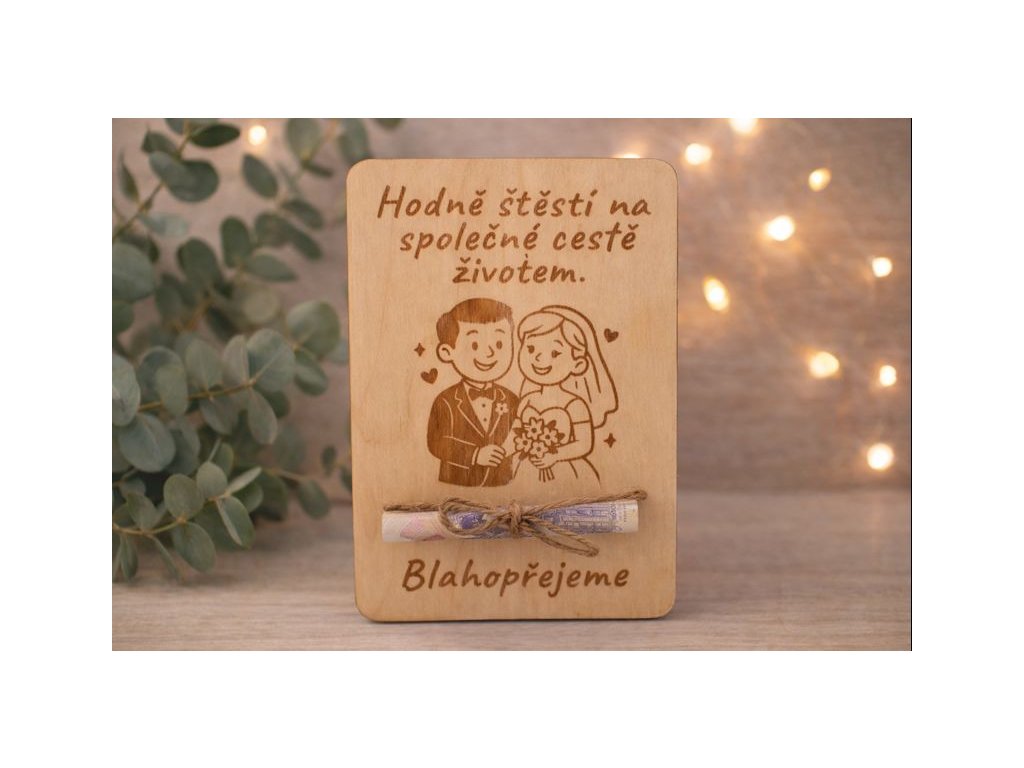 Karta je vyrobena z březové překližky o síle 3 mm, v rozměru 10 × 13,5 cm. Bankovky se jednoduše stočí do ruličky, vloží do výřezu a po vyjmutí se svážou mašličkou. Peníze tak vytvoří milou dekoraci, která zůstane jako památka na výjimečný okamžik.