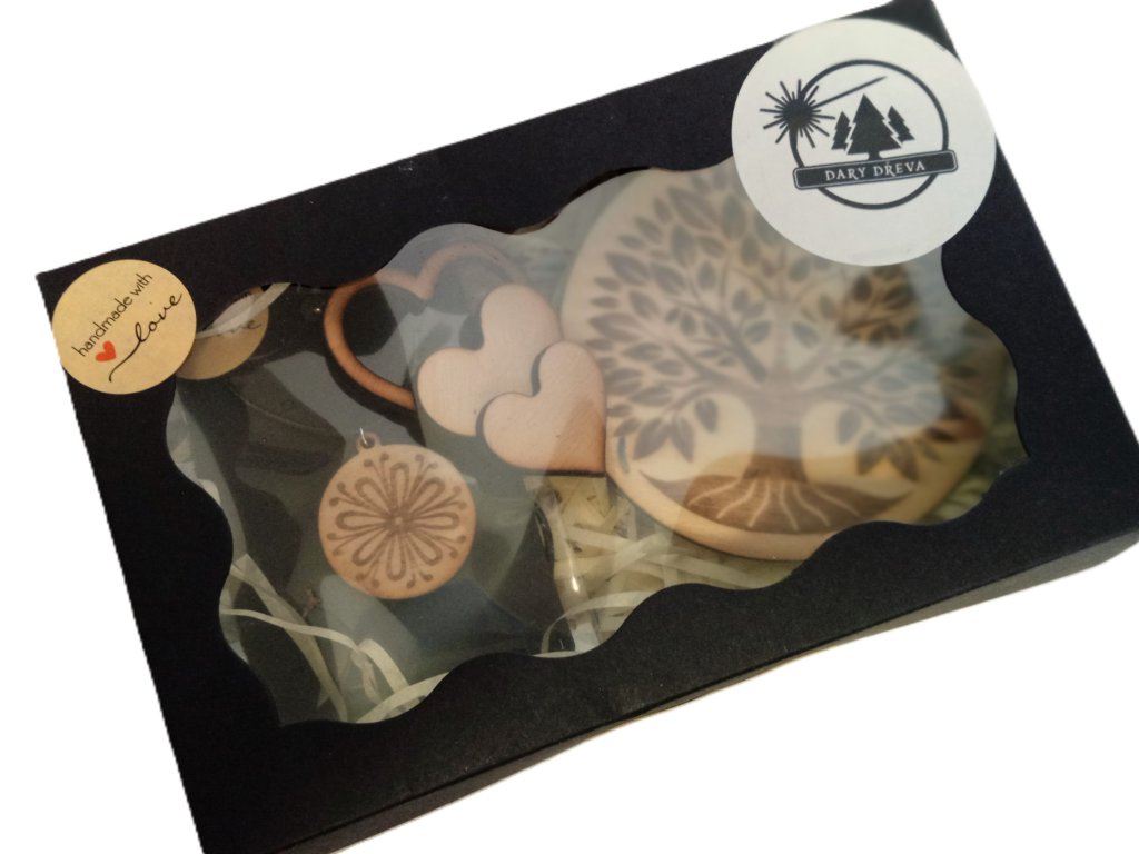 Potěšte své nejbližší originálním a ručně vyráběným dárkem. Tato krásně zabalená krabička ukrývá pečlivě nakombinované dřevěné výrobky, které v sobě spojují přírodní kouzlo a poctivou práci. Každá sada je jedinečná a připravená udělat radost – ať už k narozeninám, svátku, Vánocům nebo jen tak pro potěšení.