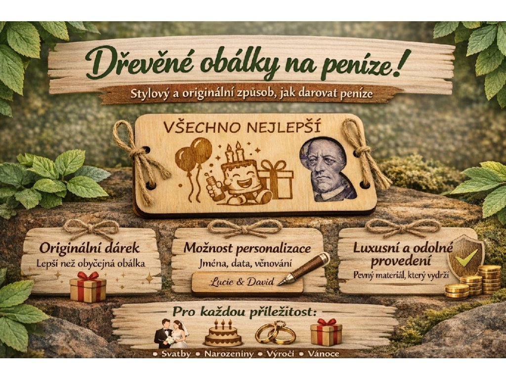 Poznámka: Peníze nejsou součástí balení – posíláme pouze dřevěnou obálku. 😊