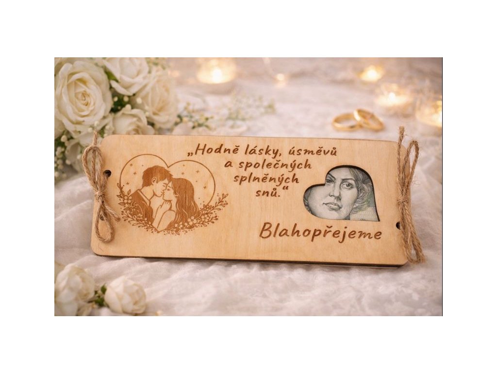 Dřevěná dárková obálka na peníze pro novomanžele