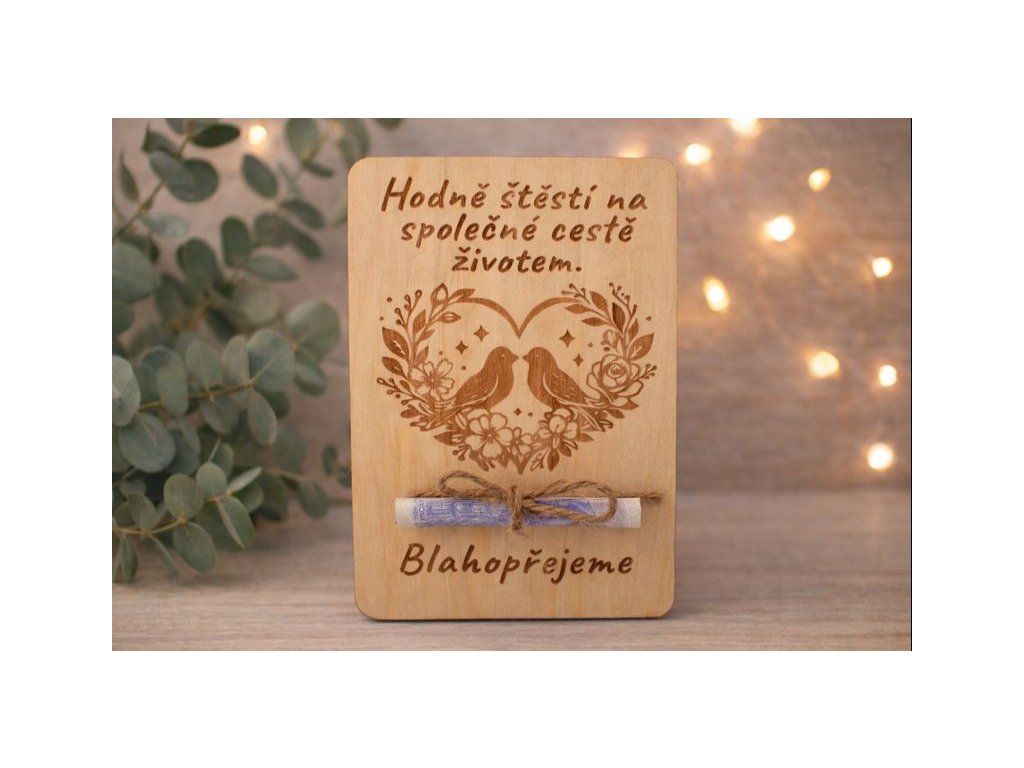Karta je vyrobena z březové překližky o síle 3 mm, v rozměru 10 × 13,5 cm. Bankovky se jednoduše stočí do ruličky, vloží do výřezu a po vyjmutí se svážou mašličkou. Peníze tak vytvoří milou dekoraci, která zůstane jako památka na výjimečný okamžik.