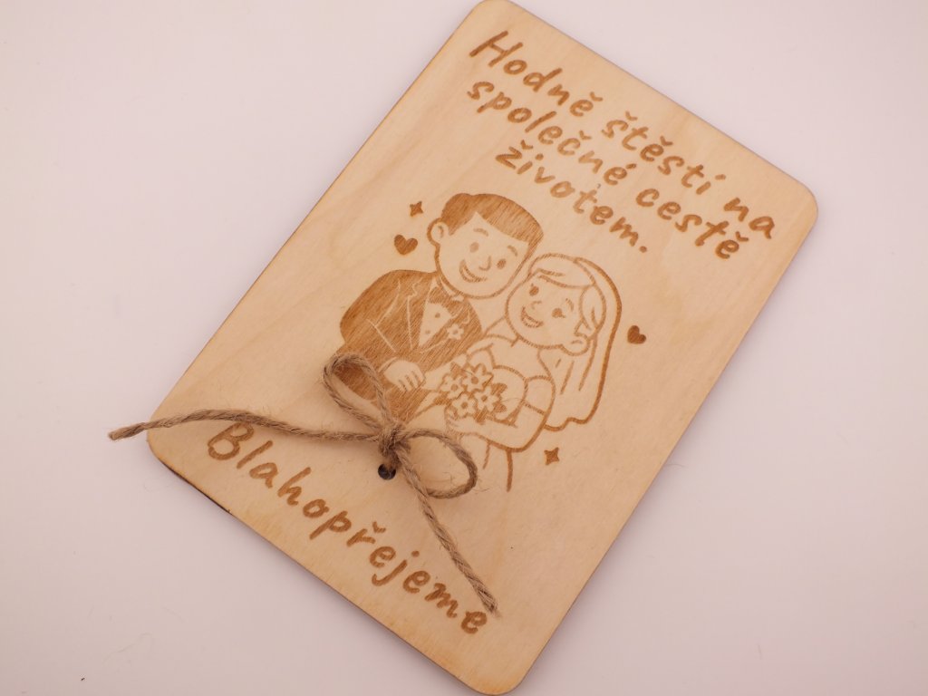 Karta je vyrobena z březové překližky o síle 3 mm, v rozměru 10 × 13,5 cm. Bankovky se jednoduše stočí do ruličky, vloží do výřezu a po vyjmutí se svážou mašličkou. Peníze tak vytvoří milou dekoraci, která zůstane jako památka na výjimečný okamžik.