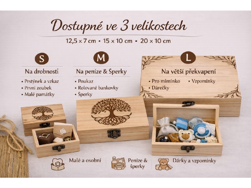 Díky třem dostupným velikostem si vyberete přesně podle obsahu – šperky, peníze, poukazy, drobné dárky i větší překvapení.