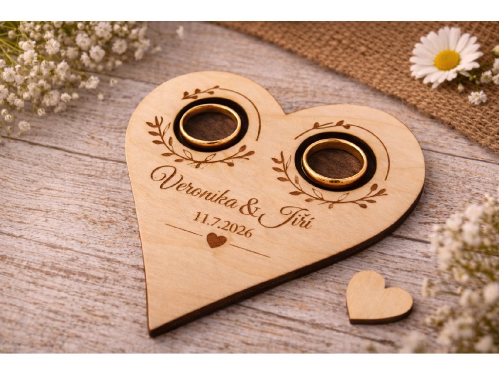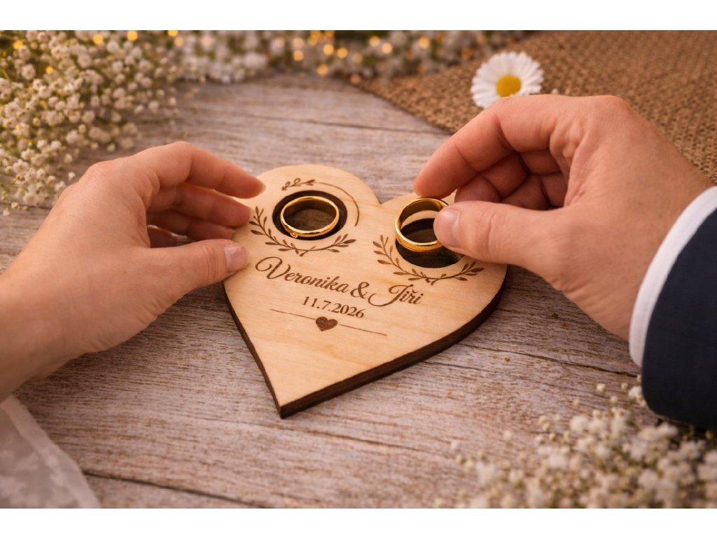 Dřevěná podložka na prstýnky ve tvaru srdce je něžný a originální doplněk pro svatební obřad. Slouží jako stylové místo pro snubní prstýnky a zároveň zůstane krásnou památkou na váš velký den.