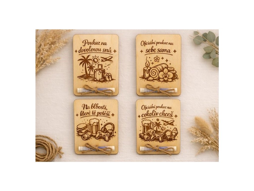 Každá poukázka je vyrobena z kvalitního přírodního dřeva a ozdobena precizním laserovým gravírováním. Díky možnosti vlastního textu, jména nebo věnování vytvoříte jedinečný dárek přesně na míru obdarovanému.