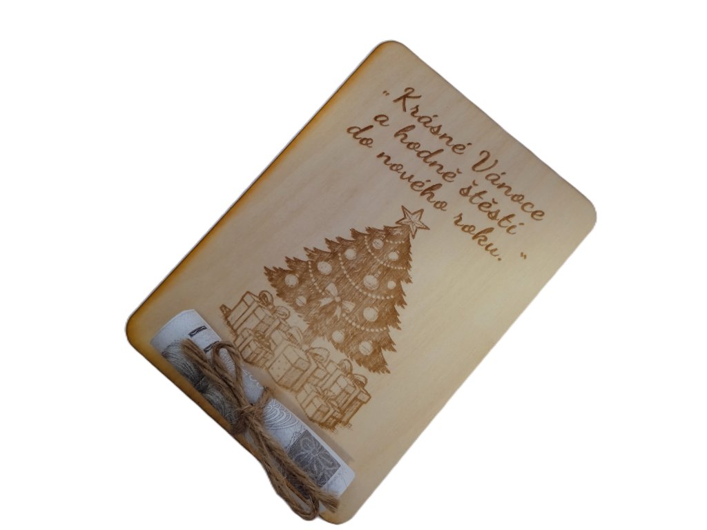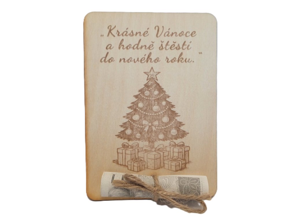 Darujte peníze netradičně a stylově! Toto přání z březové překližky o síle 3 mm a velikosti 14,5 × 10 cm je navrženo tak, aby šlo k němu jednoduše přivázat stočenou bankovku pomocí přírodního provázku.