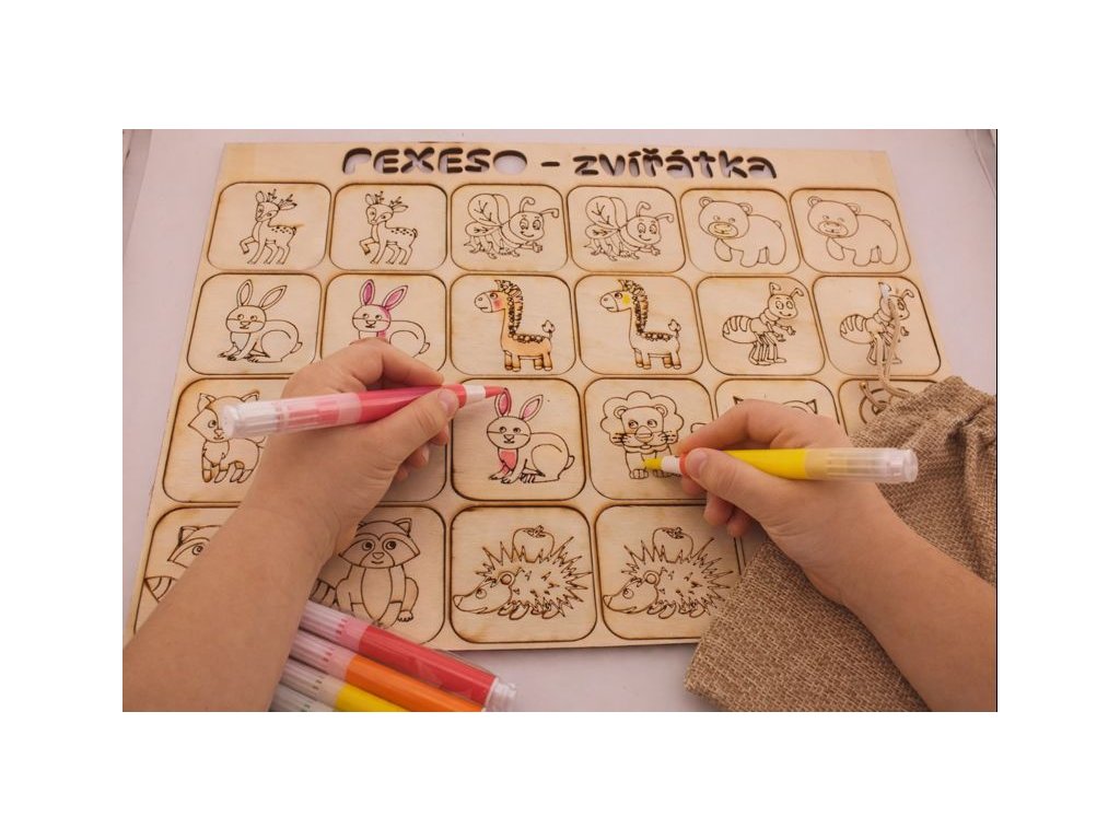 Sada obsahuje 24 pevných dřevěných kartiček s vypálenými motivy zvířátek, které si děti mohou samy domalovat pastelkami, fixy nebo barvami.