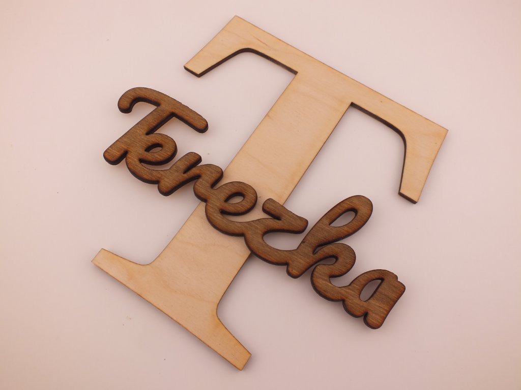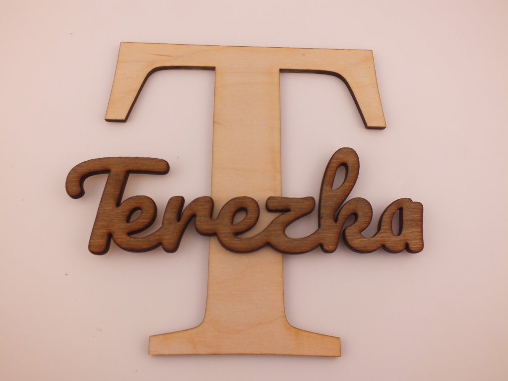 Písmo je ponecháno v přirozeném odstínu březové překližky, pro ještě hezčí a výraznější efekt je ošetřeno mořidlem, které zvýrazní strukturu dřeva a dodá jménu hloubku.
