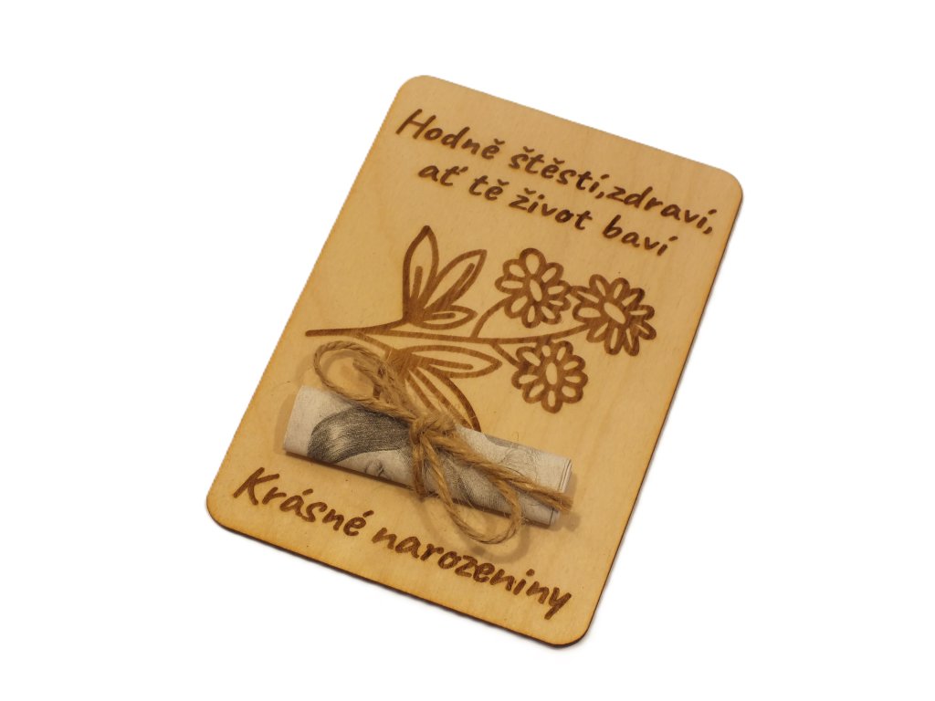 Dřevěné přání k narozeninám s možností vložení bankovky – originální a dekorativní dárek