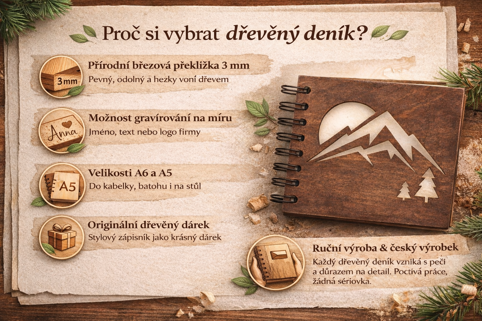 Dřevěný deník je skvělý jako dárek k narozeninám, Vánocům, výročí, pro učitele, kolegy i obchodní partnery. Spojení přírodního materiálu, kvalitního zpracování a osobního motivu dělá z každého kusu jedinečný doplněk, který má smysl i emoci.