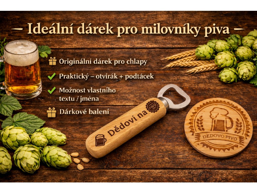 Stylový dřevěný pivní set potěší každého milovníka piva. Set obsahuje praktický otvírák na pivo a dřevěný podtácek, které chrání stůl a zároveň skvěle vypadají. Díky možnosti gravírování jména, textu nebo motivu se z pivního setu stává osobní a originální dárek.