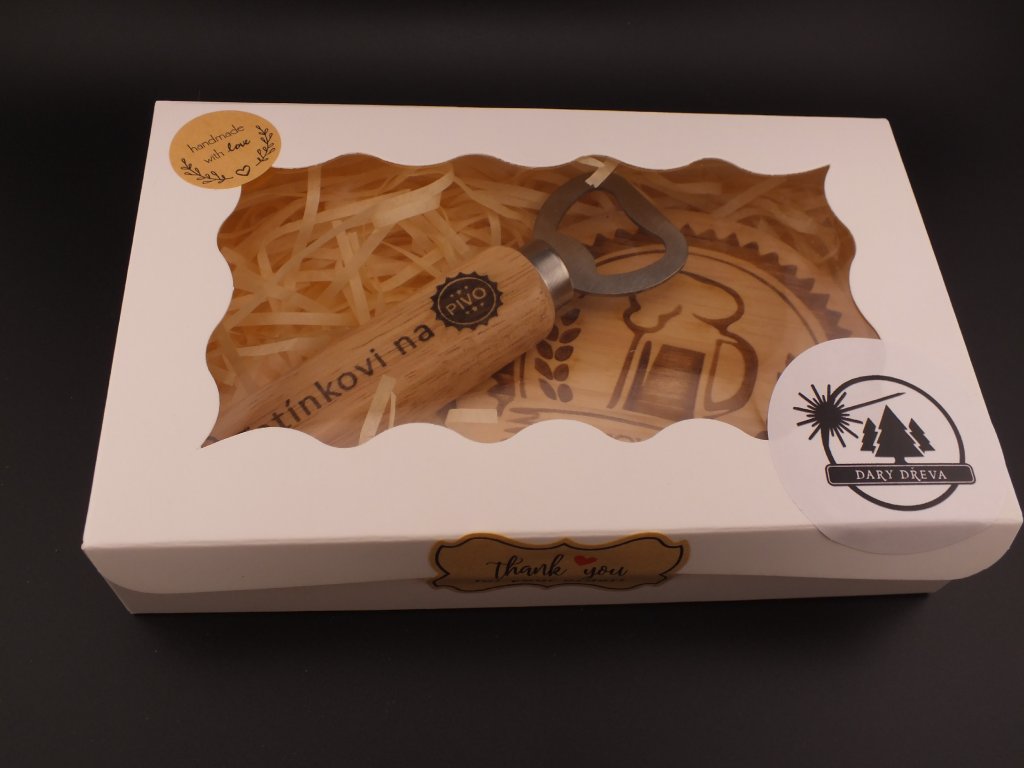 Pivní set je vyroben z kvalitního přírodního dřeva, které je pevné, odolné a příjemné na dotek. Hodí se jako dárek k narozeninám, svátku, Vánocům, pro tatínka, dědečka, kamaráda, kolegu i svědka. Ideální doplněk do domácího baru, dílny nebo ke grilu.