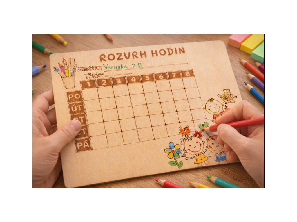 Dřevěný rozvrh hodin pro školáky – březová překližka 20×14 cm