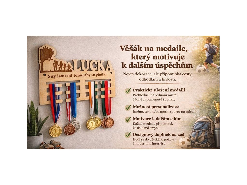 Věšák na medaile – s vlastním jménem, citátem a sportovním motivem