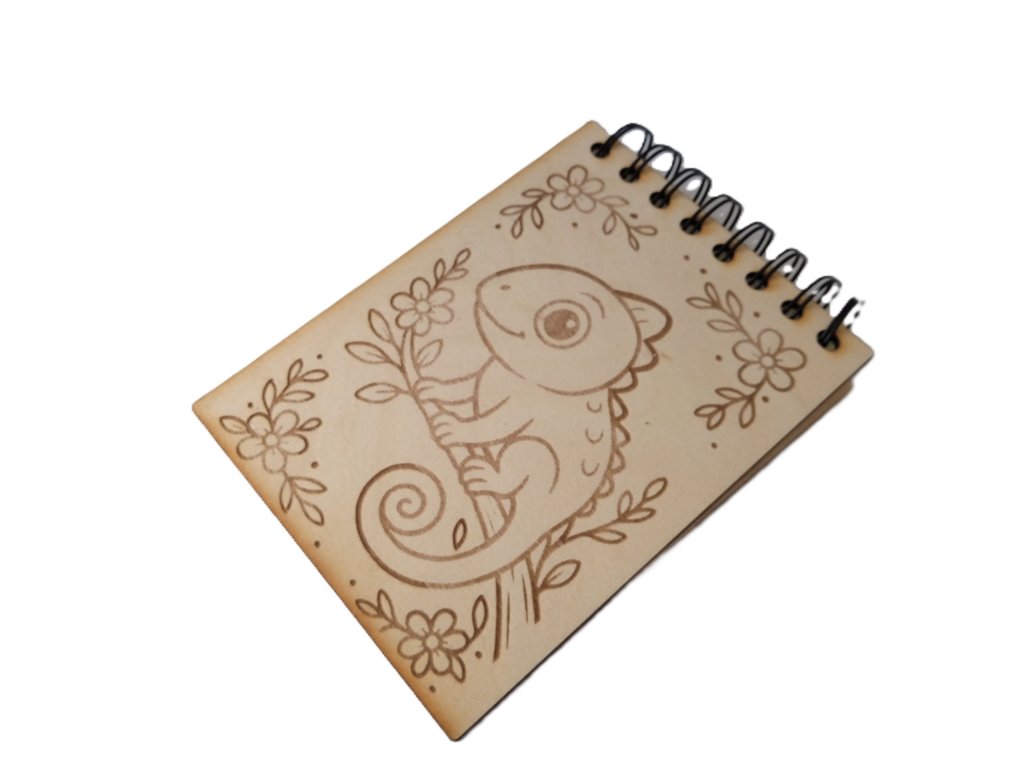 Dřevěný zápisník A6 s gravírováním – chameleon