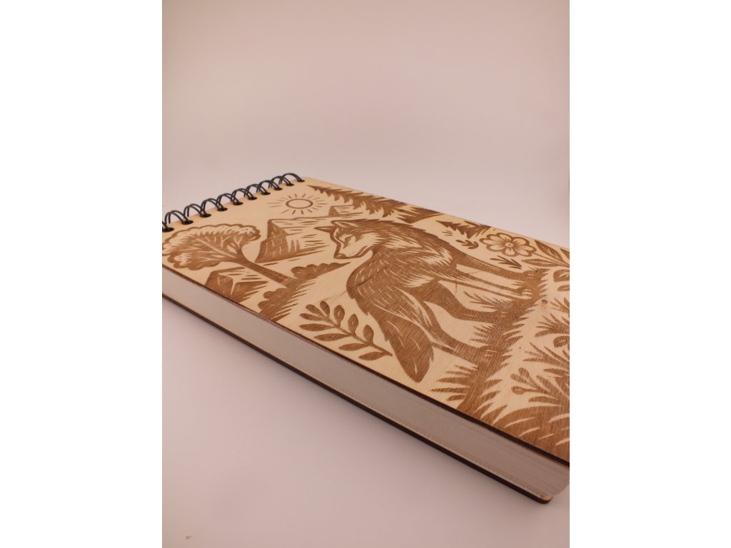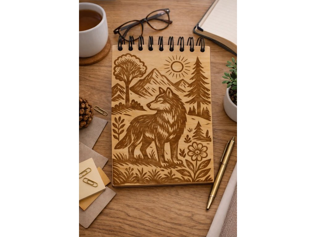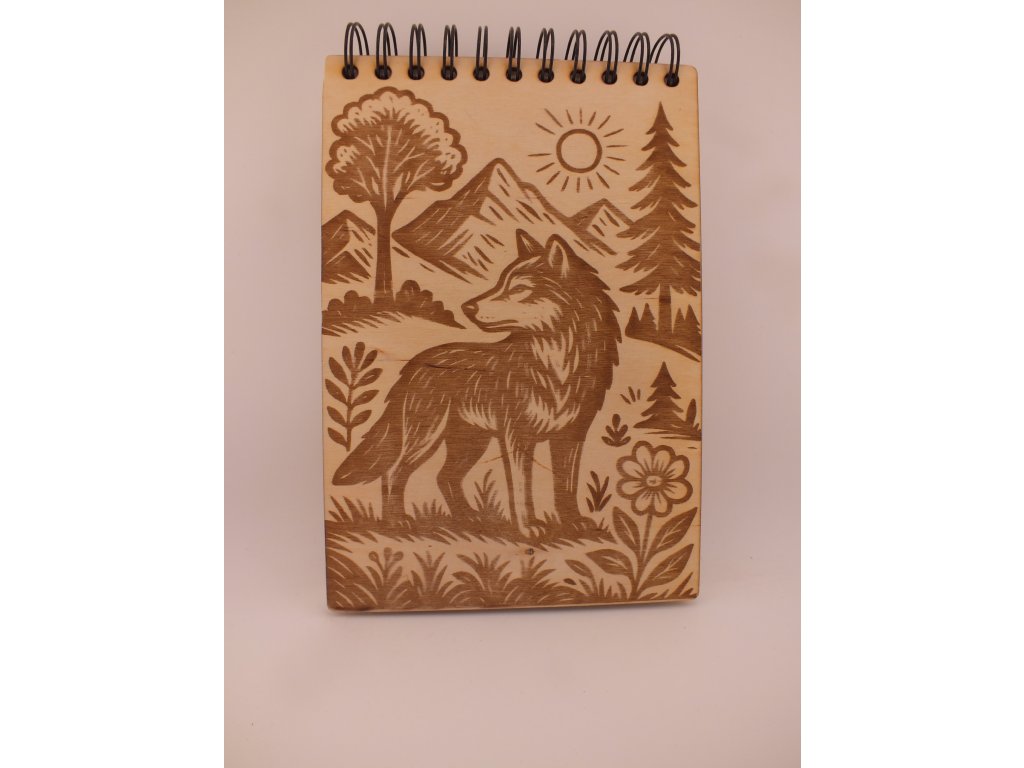 Dřevěný zápisník s gravírováním - vlk a les