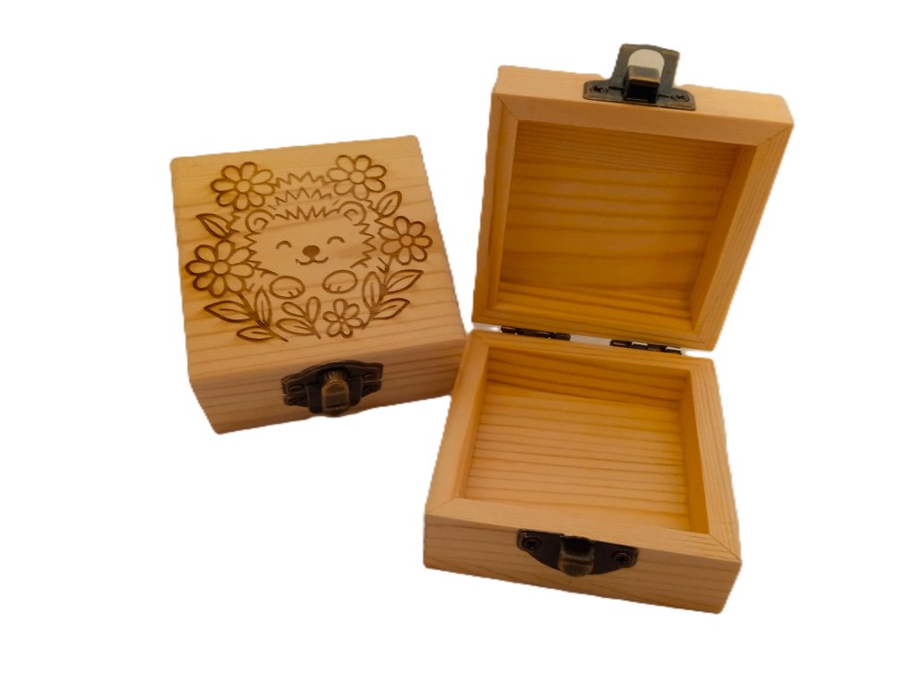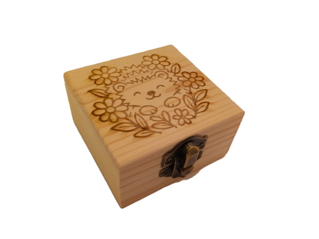 Elegantní dřevěná krabička Dřevěná krabička o rozměrech 7 × 7 x 5 cm s jemným přírodním motivem a gravírovaným obrázkem je jako stvořená pro šperky, drobnosti nebo malý dárek....