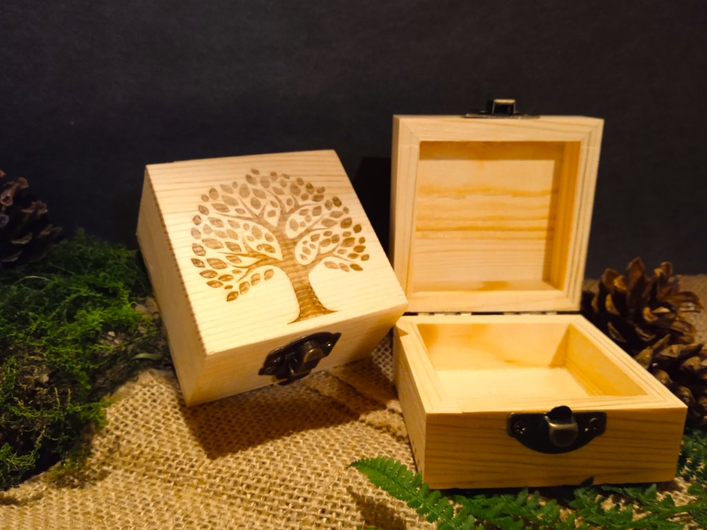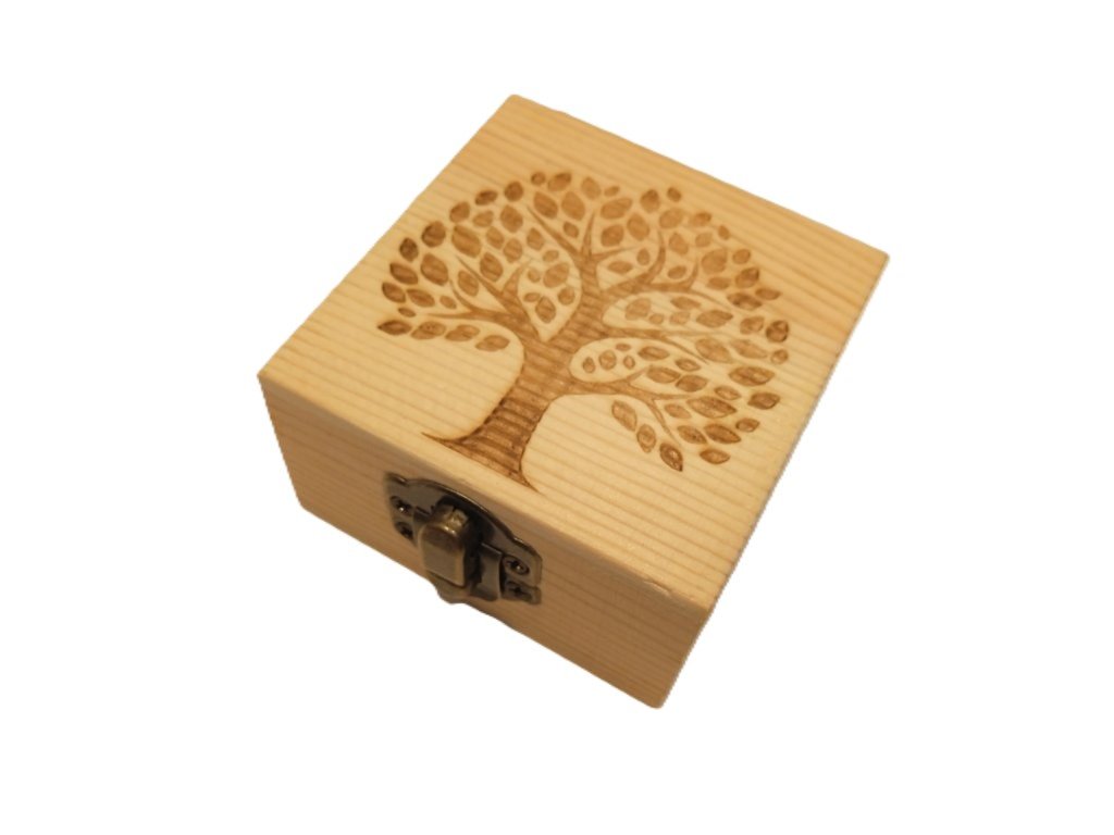 Elegantní dřevěná krabička Dřevěná krabička o rozměrech 7 × 7 x 5 cm s jemným přírodním motivem a gravírovaným obrázkem je jako stvořená pro šperky, drobnosti nebo malý dárek....