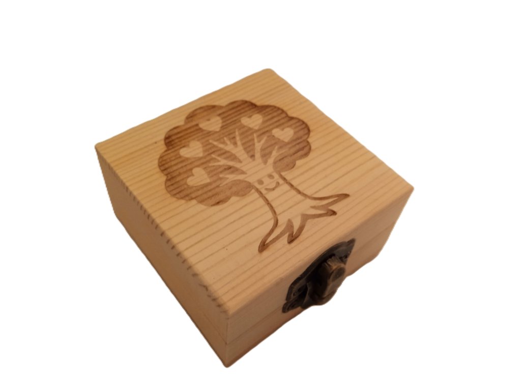 Elegantní dřevěná krabička Dřevěná krabička o rozměrech 7 × 7 x 5 cm s jemným přírodním motivem a gravírovaným obrázkem je jako stvořená pro šperky, drobnosti nebo malý dárek....