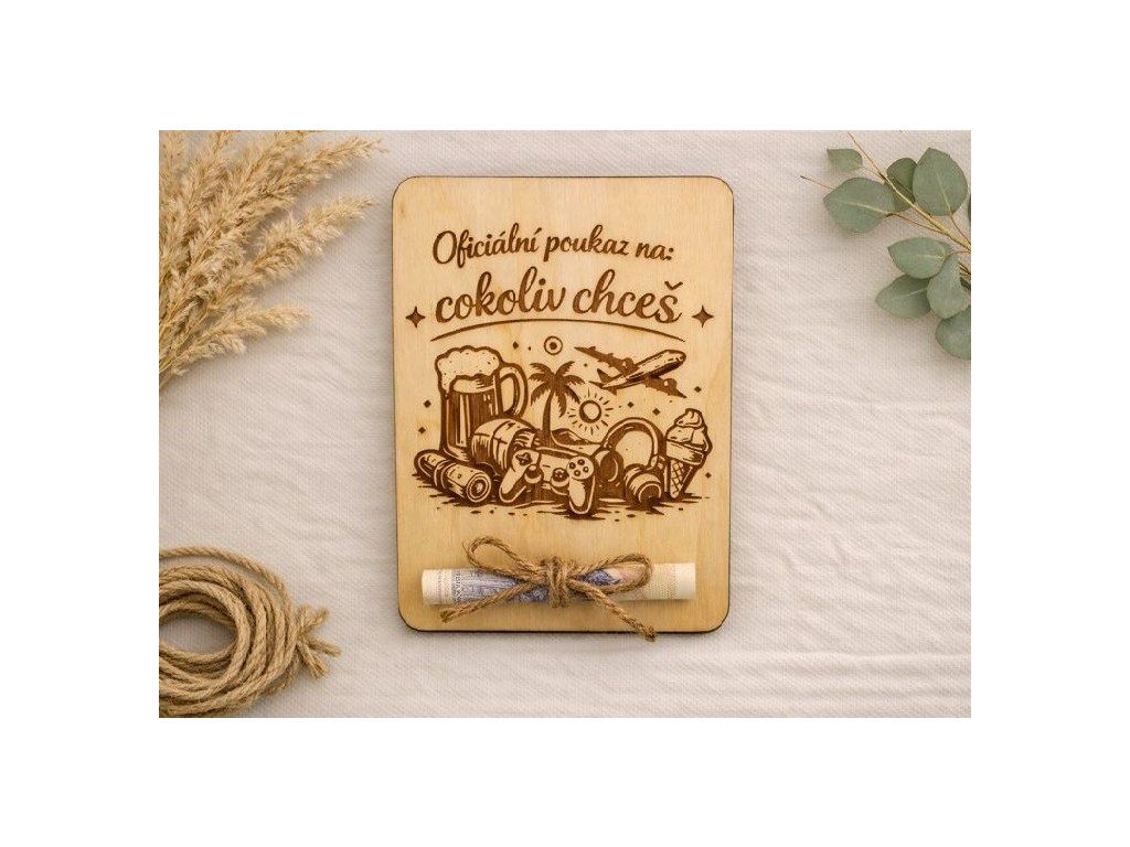Gravírovaná dřevěná poukázka na peníze - na cokoliv