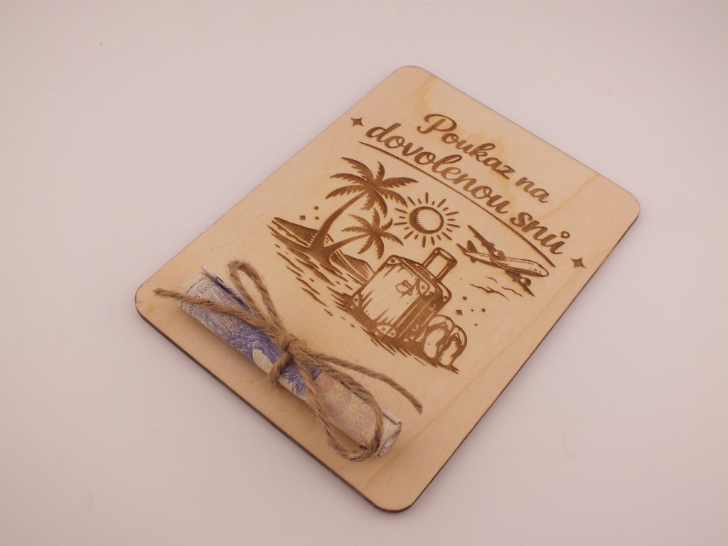 Gravírovaná dřevěná poukázka na peníze - na dovolenou snů