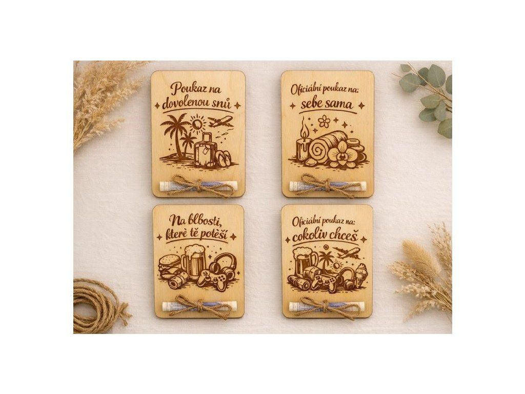 Každá poukázka je vyrobena z kvalitního přírodního dřeva a ozdobena precizním laserovým gravírováním. Díky možnosti vlastního textu, jména nebo věnování vytvoříte jedinečný dárek přesně na míru obdarovanému.