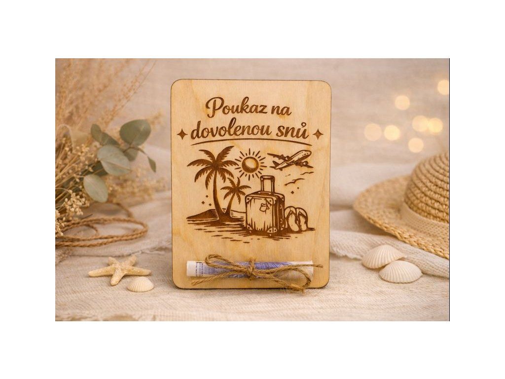 Gravírovaná dřevěná poukázka na peníze - na dovolenou snů