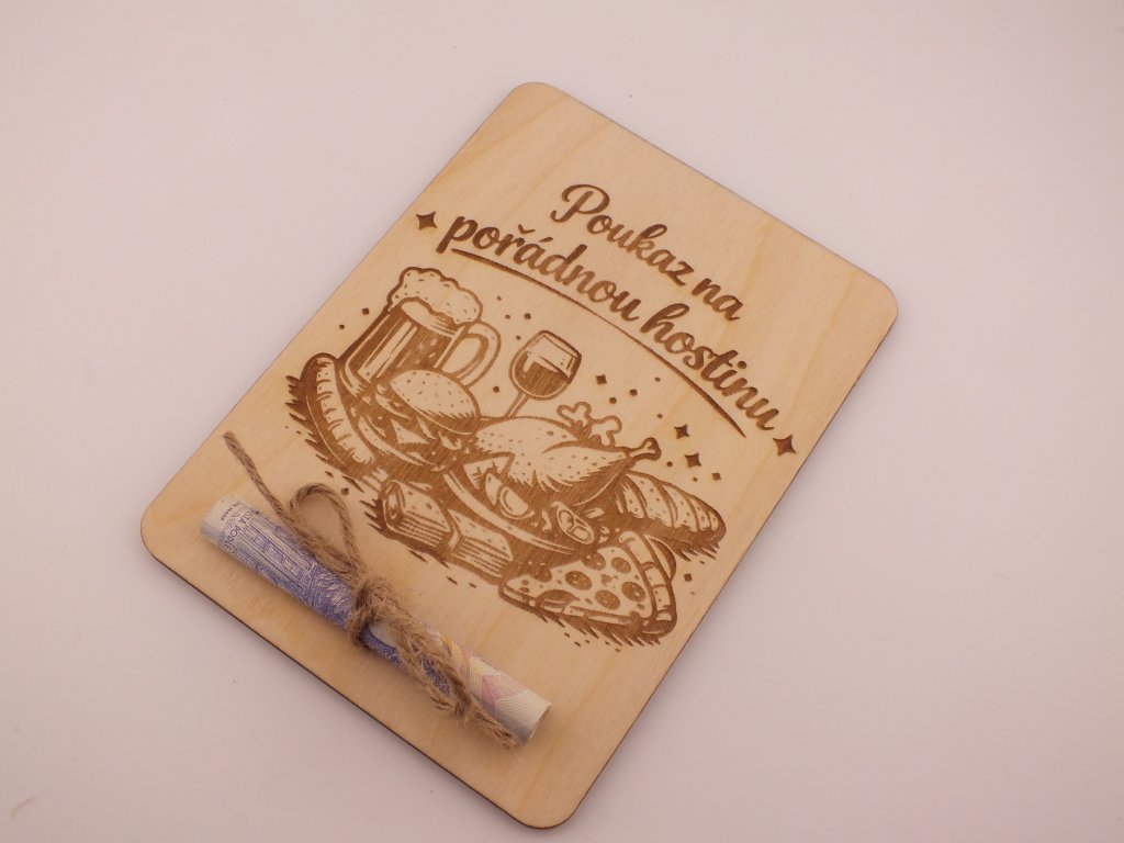 Gravírovaná dřevěná poukázka na peníze - na jídlo