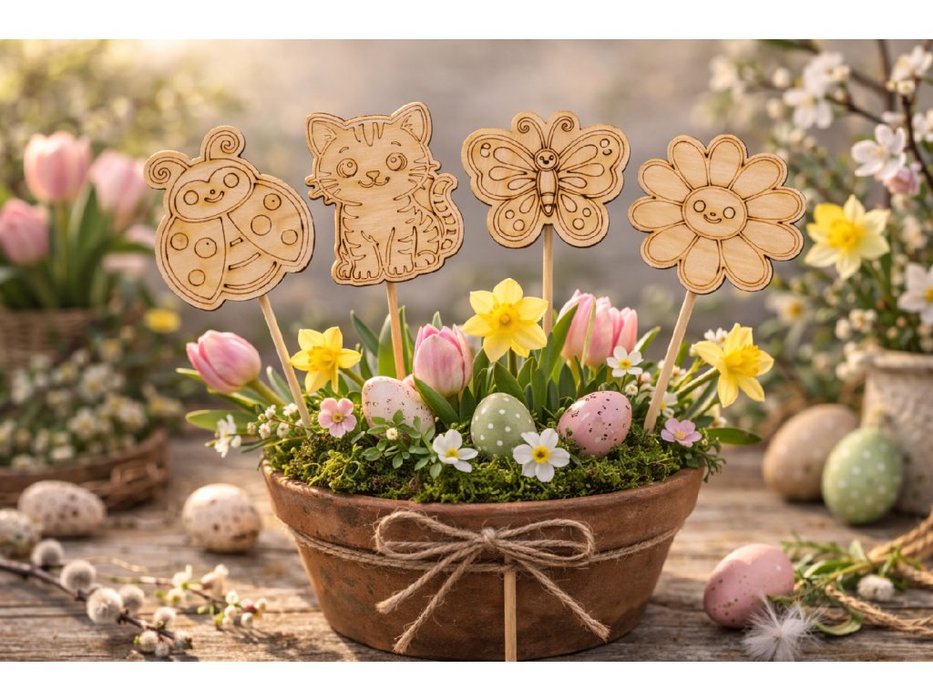 Milý jarní zápich z březové překližky krásně ozdobí květináč, truhlík i velikonoční výzdobu doma. Díky jemnému přírodnímu vzhledu jej můžete rovnou zapíchnout do hlíny jako hotovou dekoraci, nebo jej společně s dětmi dotvořit pastelkami, fixy či barvami.