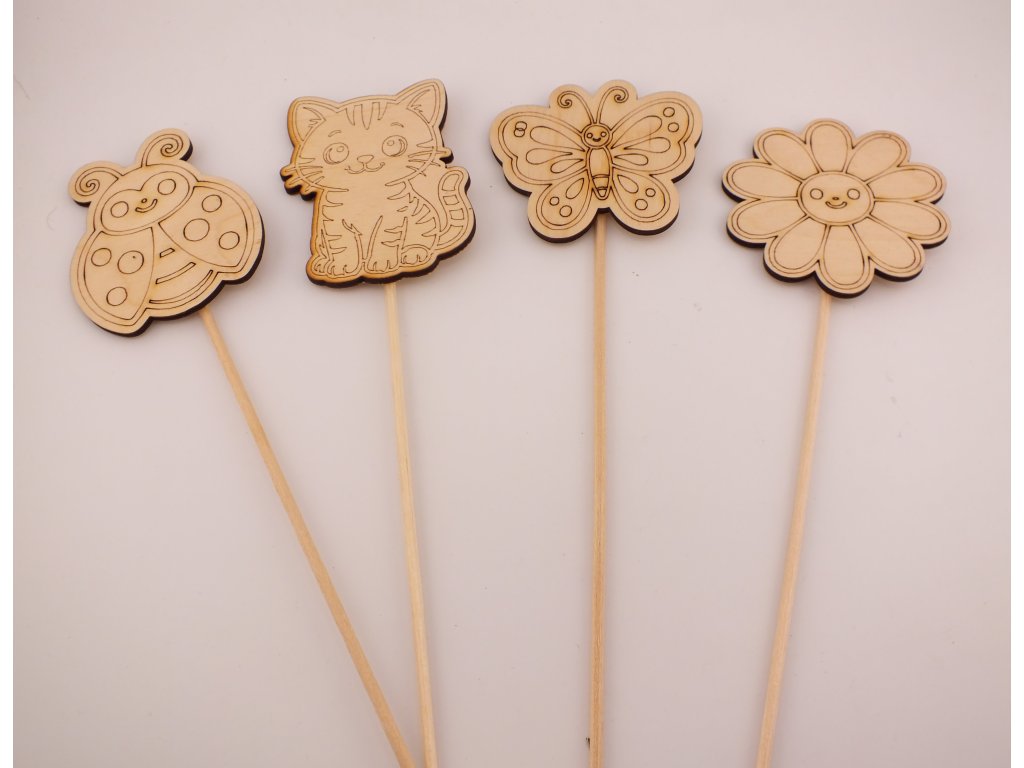 Zápich je vyroben z březové překližky o síle 3 mm, motiv má velikost cca 7 cm a je připevněn na dřevěné špejli pro snadné zapíchnutí do květináče.