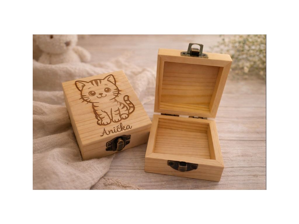 Krabička je vyrobena z kvalitního dřeva a ozdobena jemným dětským motivem, který potěší děti i rodiče. Díky možnosti personalizace (jméno dítěte, datum nebo krátký text) se stává krásnou památkou na celý život.