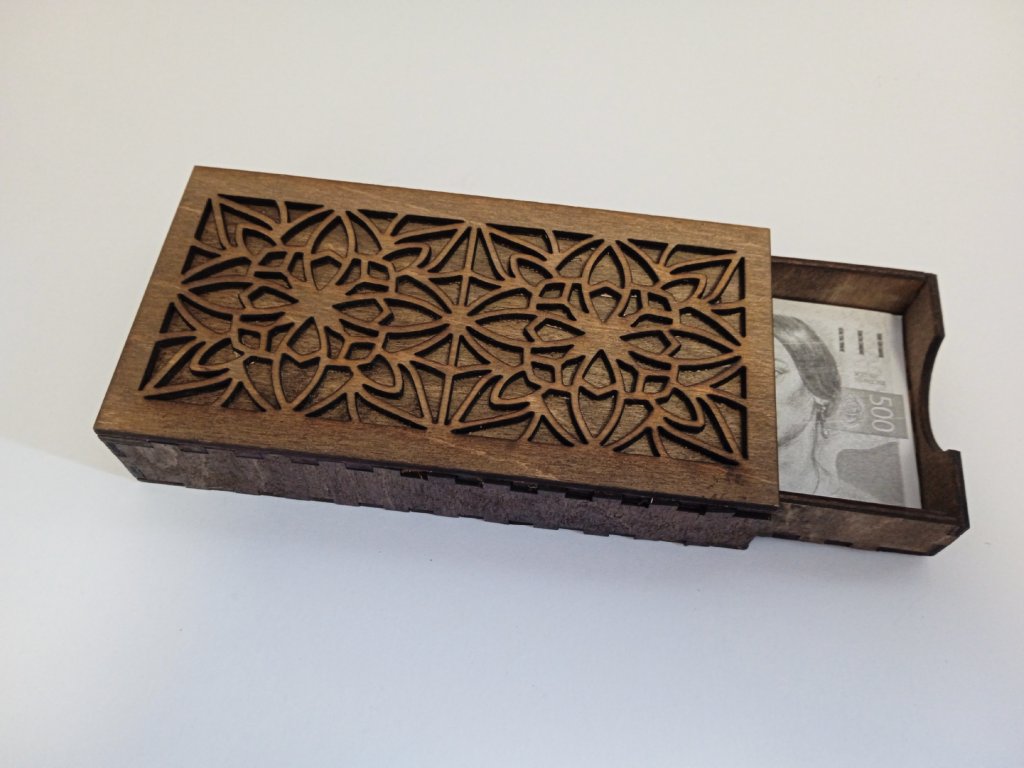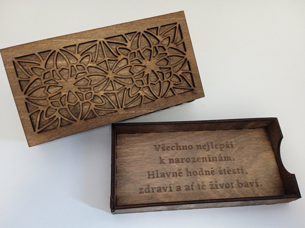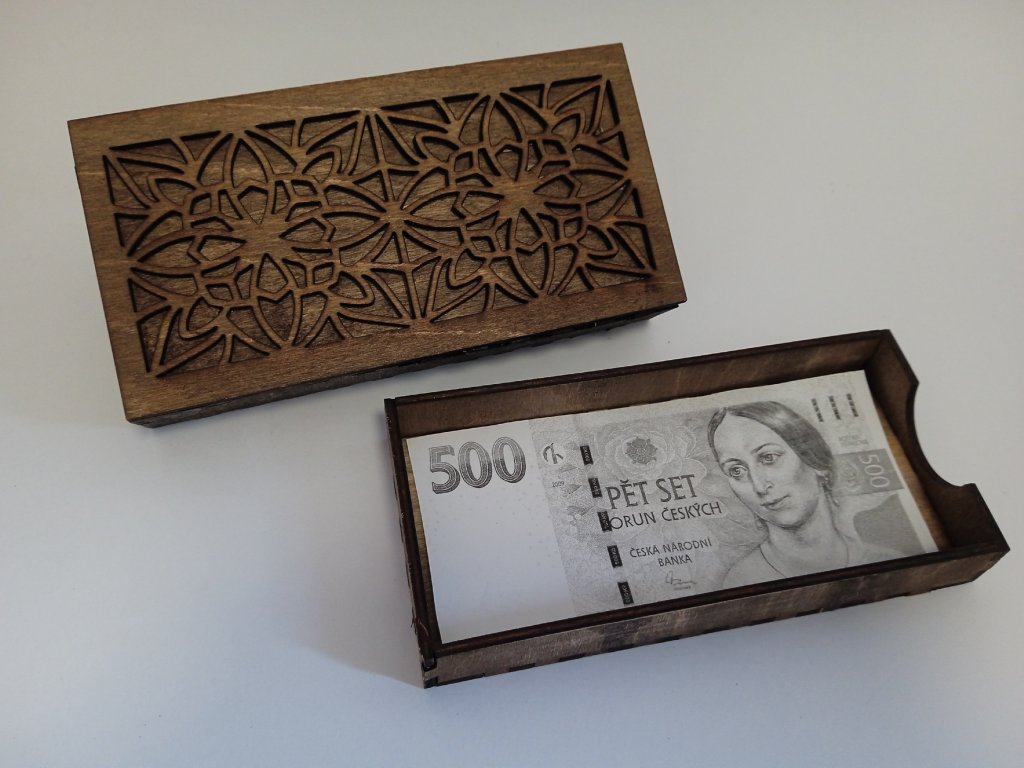 Elegantní a praktická dřevěná krabička, ideální pro originální darování peněz. Po darování nezůstane bez využití – poslouží jako stylová schránka na drobnosti a vzpomínky. Uvnitř je šuplíček, do kterého můžete přidat osobní věnování, přání k svatbě nebo gratulaci.