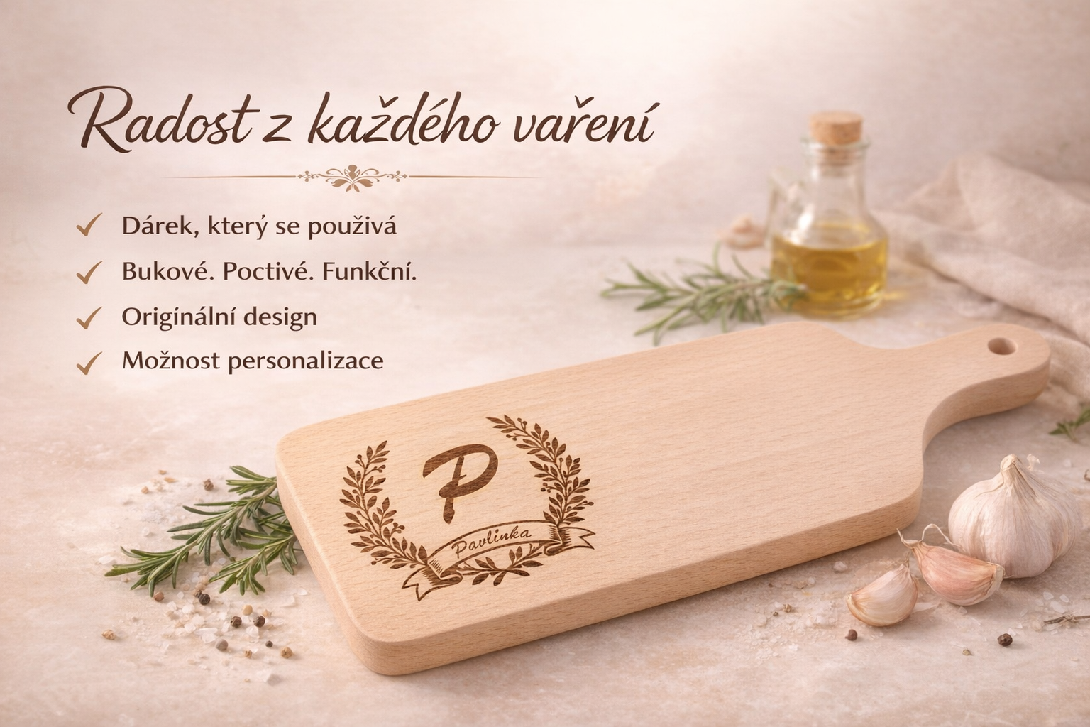 Originální, osobitý a praktický dárek, který potěší každou šikovnou kuchařku i kuchaře! Prkýnko je vyrobeno z kvalitního bukového dřeva a ozdobené gravírovaným textem či obrázkem  Díky tomu se z obyčejného kuchyňského náčiní stává jedinečný kousek s osobním dotekem.