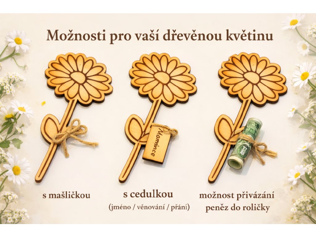 Jemný přírodní dárek vyrobený z březové překližky, ideální pro maminku, babičku, učitelku nebo kohokoliv, komu chcete udělat radost drobností s emocí.