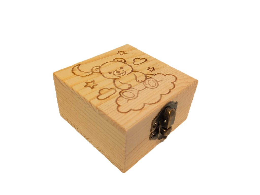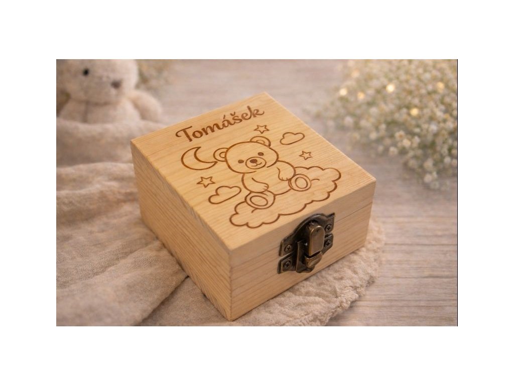 Krabička je vyrobena z kvalitního dřeva a ozdobena jemným dětským motivem, který potěší děti i rodiče. Díky možnosti personalizace (jméno dítěte, datum nebo krátký text) se stává krásnou památkou na celý život.