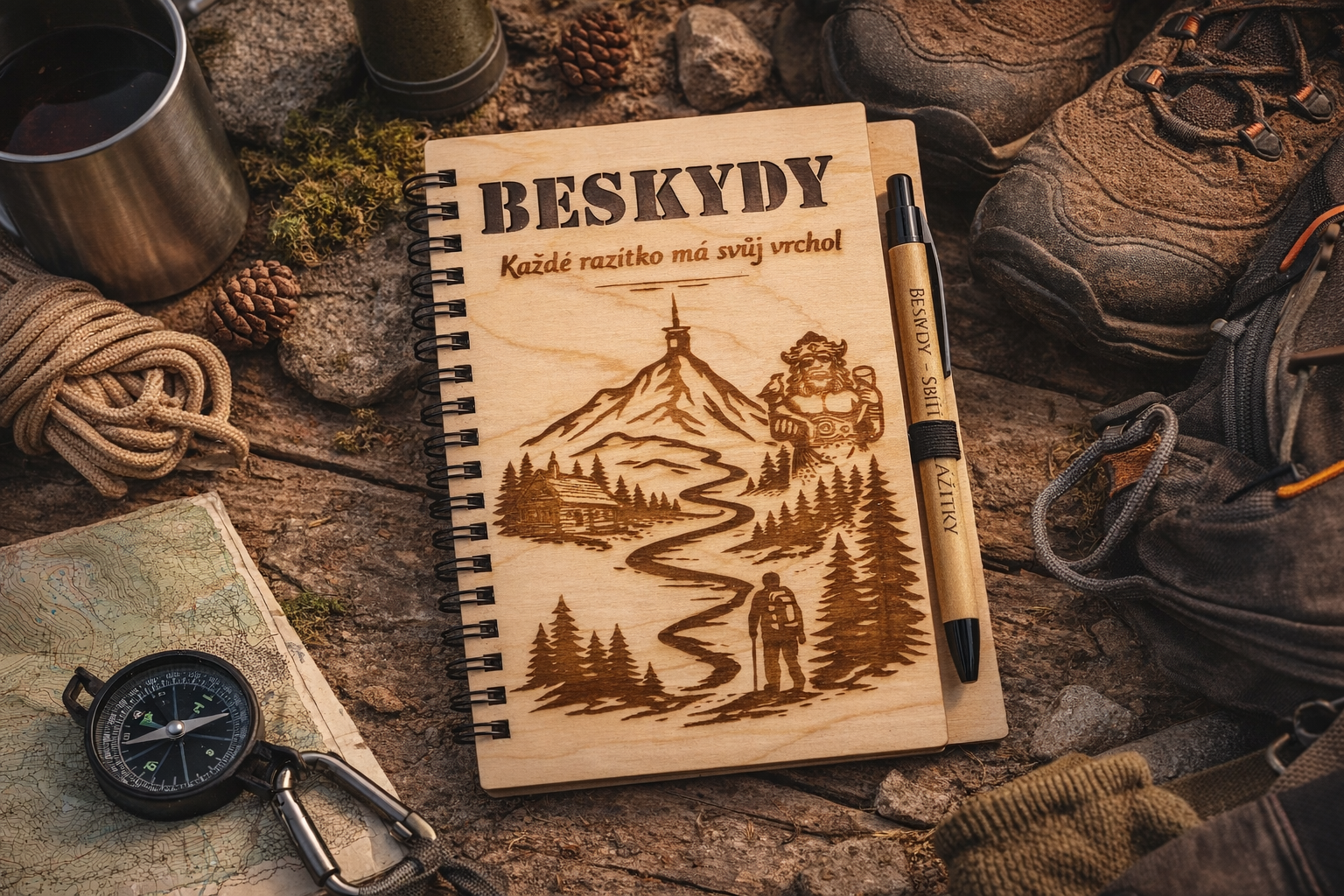 Deník prošel mnoha designovými návrhy a úpravami, než jsme dospěli k finální podobě. Chtěli jsme, aby byl jednoduchý, přirozený a zároveň typický pro Beskydy – aby nepůsobil jako obyčejný zápisník, ale jako věc, která do hor opravdu patří.