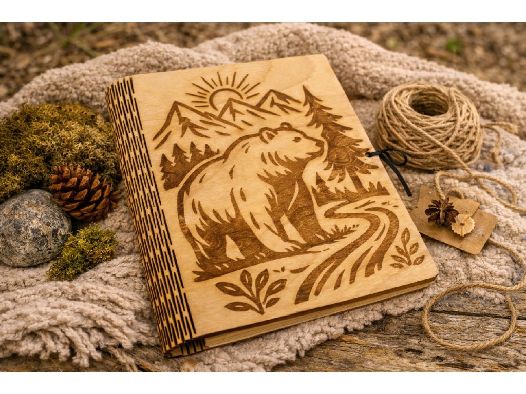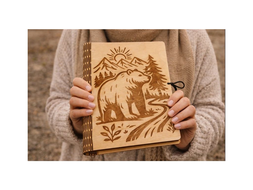 Ohebný dřevěný deník z jednoho kusu dřeva – medvěd