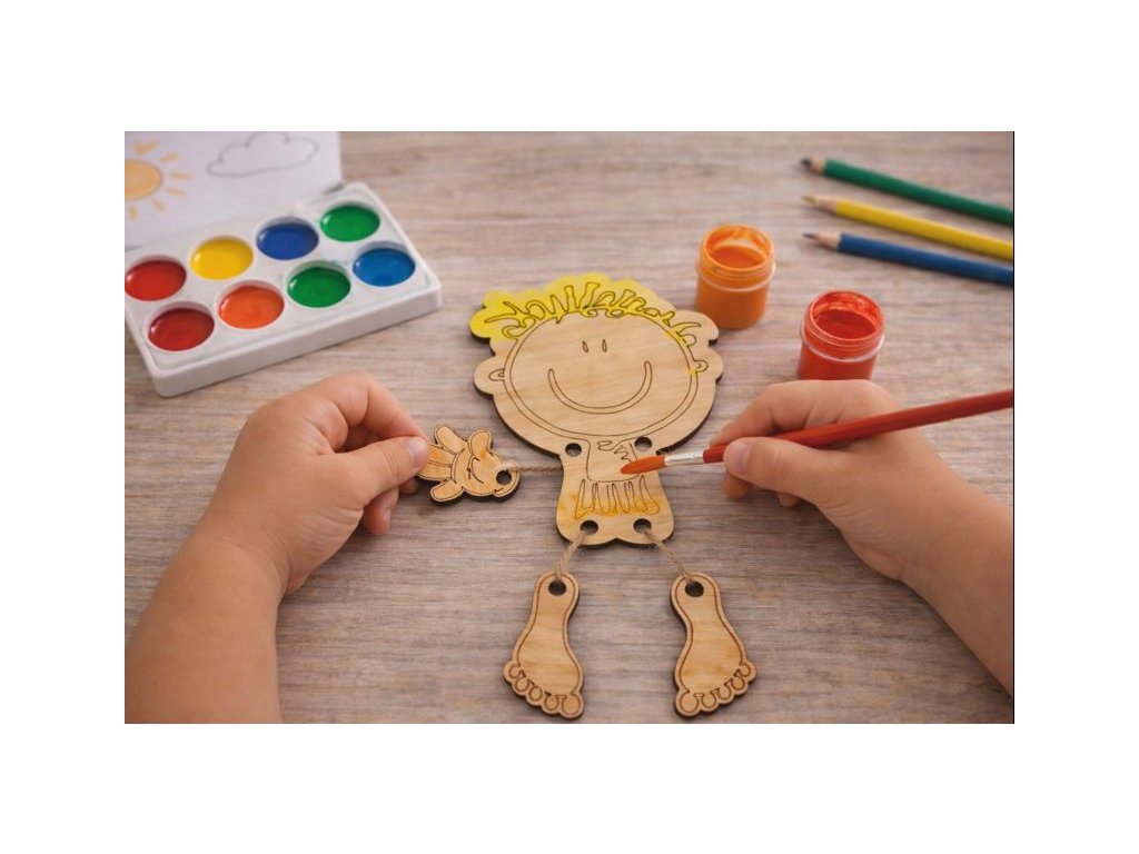 Veselá dřevěná postavička k dotvoření je skvělou kreativní hračkou pro děti, které si ji mohou samy vybarvit a dozdobit dle vlastní fantazie. Součástí balení jsou ručičky i nožičky, které se připevní provázkem – vznikne tak originální a pohyblivá postavička.