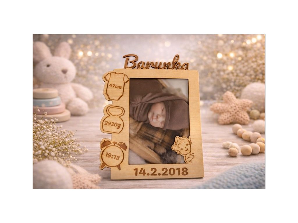 Na rámeček vám vygravírujeme jméno, datum narození, čas a míry (váhu a délku při narození). Vznikne tak jedinečná památka na první okamžiky života dítěte.