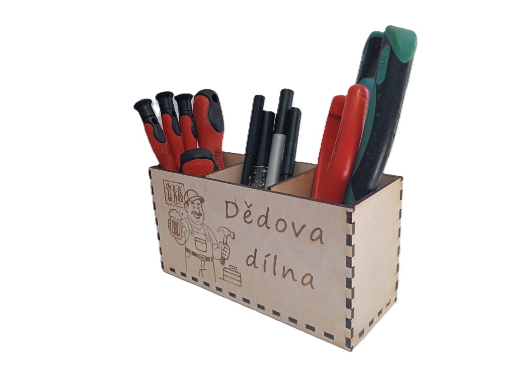 Praktický a originální dřevěný stojánek na nářadí potěší každého kutila, ať už je to tatínek, dědeček nebo manžel. Stojánek je vyroben z kvalitní březové překližky o velikosti 18 × 9,5 × 7 cm a díky veselému gravírování vnese do každé dílny i garáže nejen pořádek, ale i úsměv.
