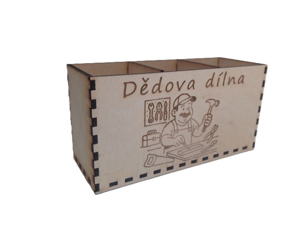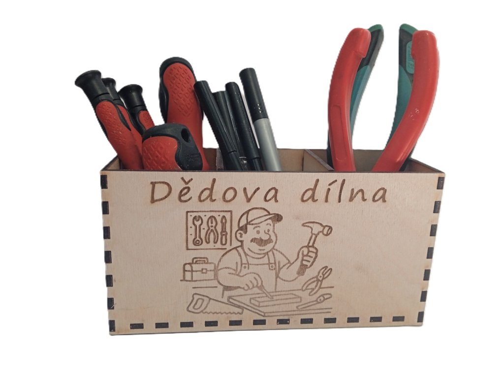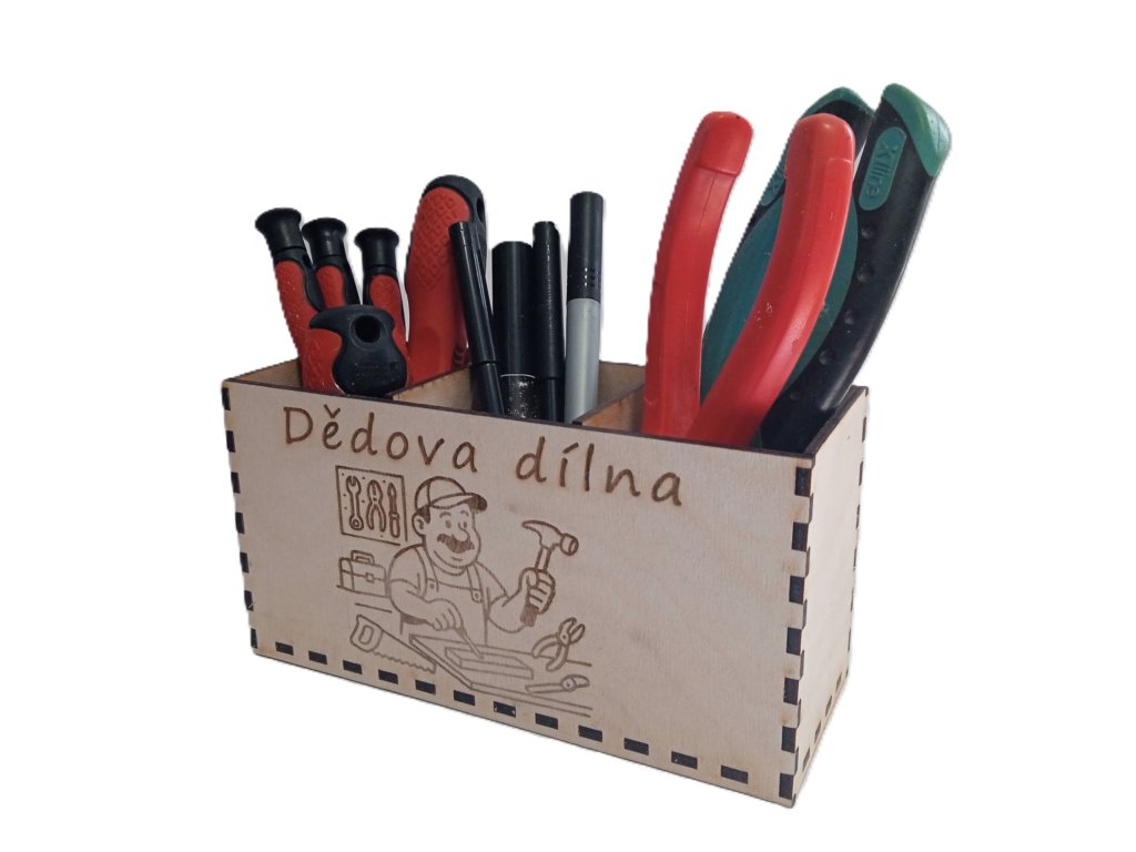 Praktický a originální dřevěný stojánek na nářadí potěší každého kutila, ať už je to tatínek, dědeček nebo manžel. Stojánek je vyroben z kvalitní březové překližky o velikosti 18 × 9,5 × 7 cm a díky veselému gravírování vnese do každé dílny i garáže nejen pořádek, ale i úsměv.