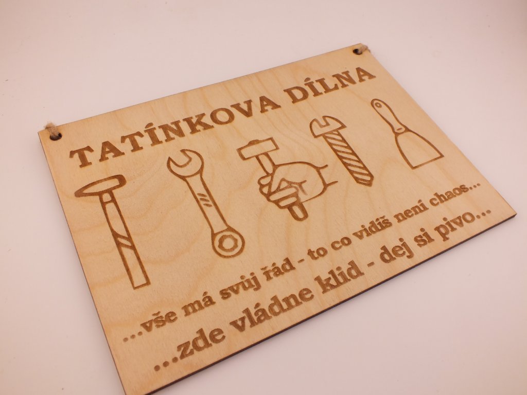 Cedulka je vyrobena z kvalitní březové překližky, gravírovaná s důrazem na detail a zachovaná v přírodním odstínu dřeva. Díky otvorům a provázku je připravena rovnou k zavěšení – na dveře dílny, zeď nebo do garáže.
