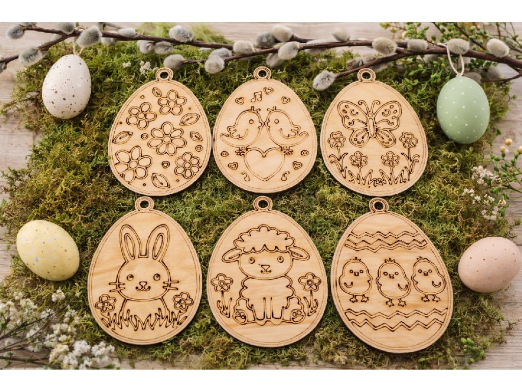 Jemná dřevěná velikonoční vajíčka na zavěšení jsou krásnou ozdobou jarních větviček, věnců i oken. Díky přírodnímu vzhledu březové překližky působí něžně a hodí se do moderní i tradiční výzdoby.