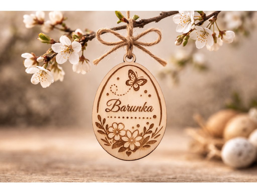 Jemný gravírovaný motiv se zajíčkem dodává dekoraci hravý vzhled a díky možnosti personalizace vznikne originální ozdoba na míru. Vajíčko se krásně vyjímá zavěšené na větvičkách ve váze, na jarním věnci nebo jako drobný dárek do velikonoční výslužky.