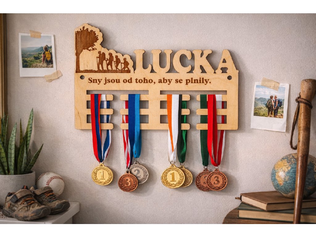 Věšák na medaile – s vlastním jménem, citátem a sportovním motivem